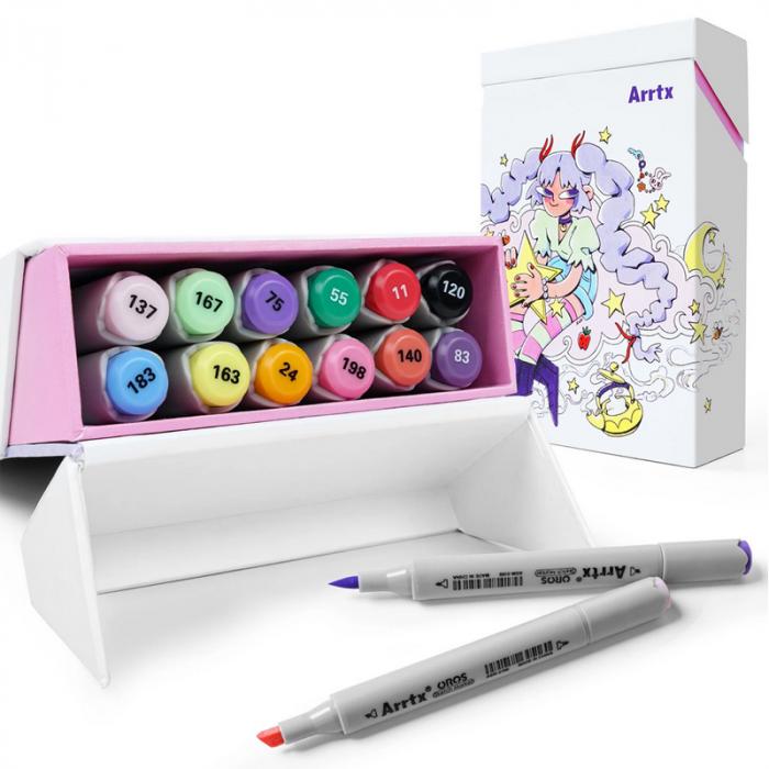 Itin ryškūs ir kokybiški profesionalūs markeriai-flomasteriai ARRTX Oros, skirti piešimui, iliustravimui, eskizavimui, ryškinimui, atvaizdavimui. Komplekte yra 12 pastelinių atspalvių. Šis markerių-flomasterių rinkinys pateikiamas su stilingo dizaino dėžute. Dėžutė sukurta taip, kad kiekvienas markeris-flomasteris turėtų atskirą skyrių, o atidarius dėžutę jos dangtis galėtų būti naudojamas kaip stovas. Tuščia dėžutė gali būti naudojama kaip daiktadėžė.